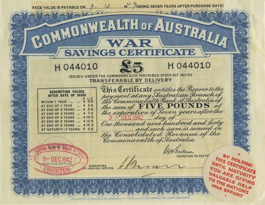 The Great Depression reached Australia’s shores and the impact was profound. Australia’s unemployment reached a peak of 32 percent in 1932. The outbreak of war in 1939 meant the government of the time needed to raise funds quickly to pay for supplies. In a depression with people barely able to afford food and basic supplies for life, funds were not going to be easily forthcoming. The Australian Government created a means for the public to support the war effort that would also benefit the people at the same time: war saving certificates. These were bonds that could be purchased for very little money but redeemed after seven years for the amount printed on the certificate. These could be bought for as little as sixteen shillings (approximately $19.64 AUD today) but could then be cashed in for £5 (or $613 in today's Australian money) by purchasing the certificates and then holding them for a period of time.