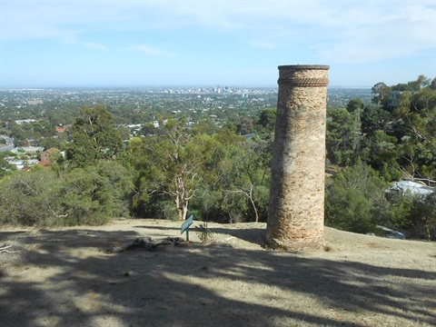 Enter at Toll Gate Car Park off Gill Terrace. The trail zigzags up a steep slope past the heritage listed mine chimney through an open woodland of mainly nonindigenous trees. At Danthonia Reserve the track splits into the upper and lower parts of the loop trail. Take the left hand trail up to the top of the reserve and return to the zigzag track via the lower trail. The vegetation in Danthonia Reserve is a regenerating open woodland of SA Blue Gum, Grey Box and Red Gum.
