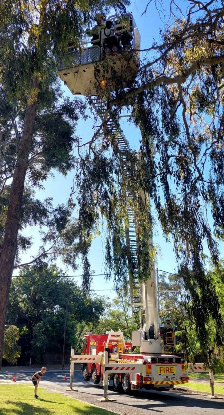 Burnside local Jarvis, a 13 year old koala, needed help from Koala Rescue as he was bitten on the back and hind leg by an uncontrolled dog. Beulah Park MFS assisted Koala Rescue with a Bronto Skylift in the rescue. Koalas have little fat for protection so internal organs can easily be punctured. Merridy from Koala Rescue, pictured with Jarvis, was concerned about possible damage to his gut because his skin was broken. So Jarvis was rescued and taken to the Koala Rescue clinic for observation. Jarvis was given the all clear by a Vet and later returned to his home.
