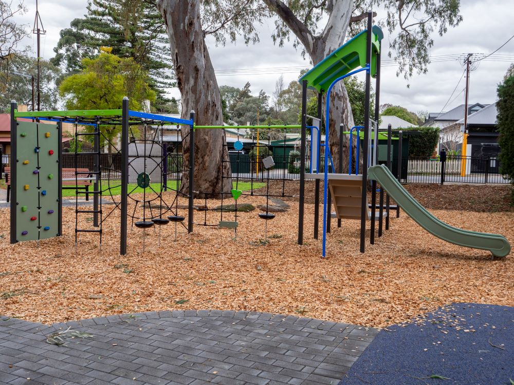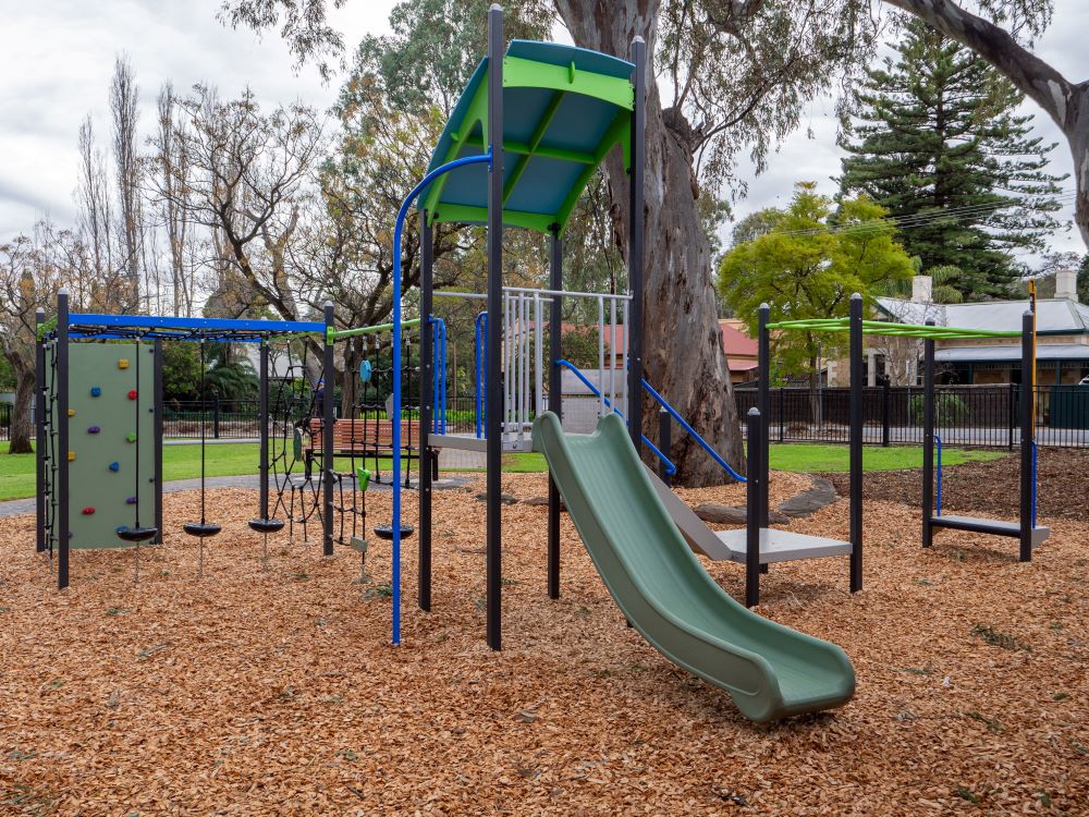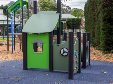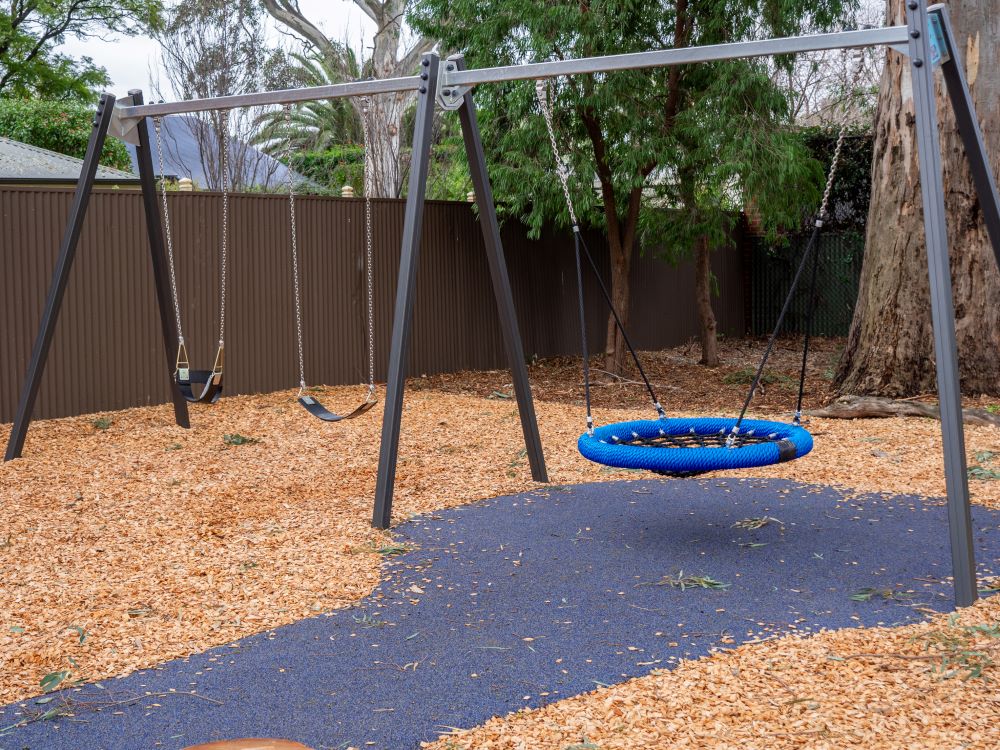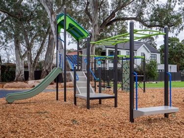 This reserve is fenced from the road with a child proof lock on the gate and contains a range of playground equipment. A path leads from the road into the centre of the play space, where rubber softfall allows access to some inclusive play elements. The large trees are River Red Gum.